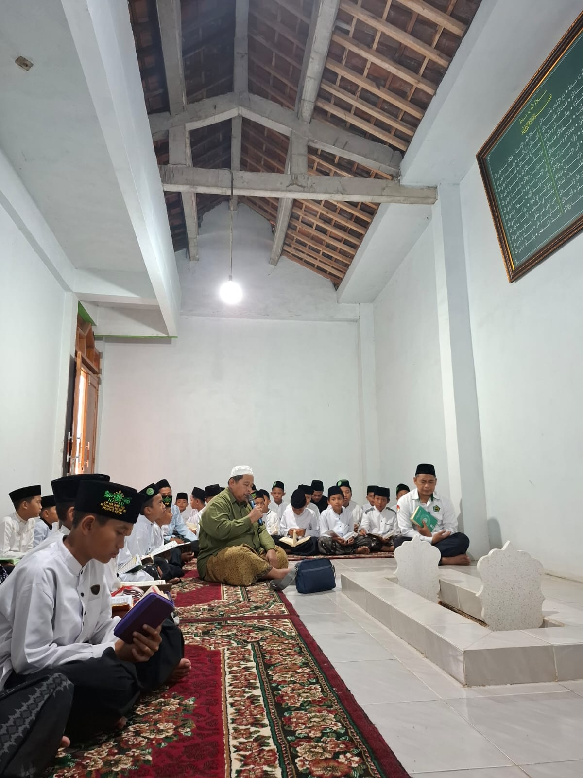 Pada sesi berikutnya, siswa dibagi dalam beberapa kelompok untuk mengikuti halaqah tadarus Al-Qur’an. Suasana khidmat dan penuh kekhusyukan terasa ketika siswa membaca dan menyimak ayat-ayat suci Al-Qur’an secara bergiliran. Selanjutnya, para siswa mengikuti rangkaian peringatan Hari Santri Nasional bersama santri-santri pondok, yang diisi dengan pembacaan Maulid Nabi, hadroh, serta berbagai penampilan dari santri pondok pesantren. Kegiatan ini memberikan kesan mendalam sekaligus menambah kecintaan siswa terhadap tradisi Islam dan budaya pesantren.